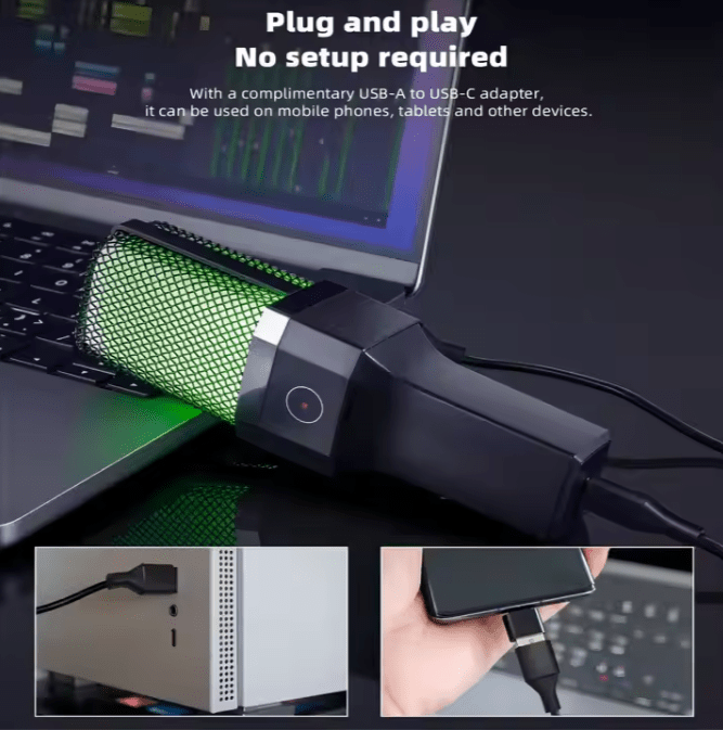 Plug‑and‑play USB condenser mic with RGB breathing lights.