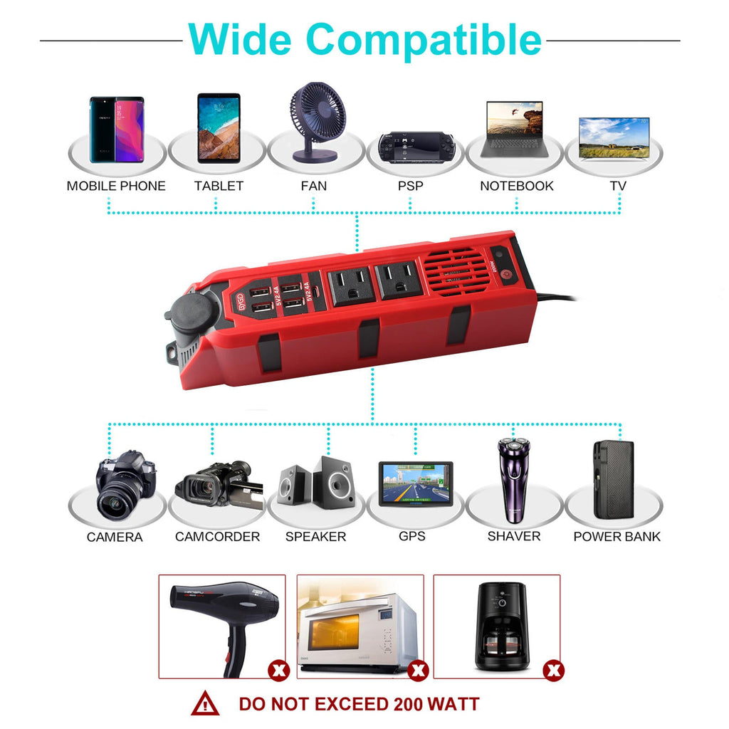 A compact car‑power solution that converts your vehicle’s 12V DC cigarette‑lighter socket into two grounded AC outlets, four fast‑charge USB‑A ports, and an auxiliary DC socket. Ideal for road trips, camping, or emergency backup, it delivers reliable power for laptops, cameras, smartphones, and other small electronics wherever you go.
