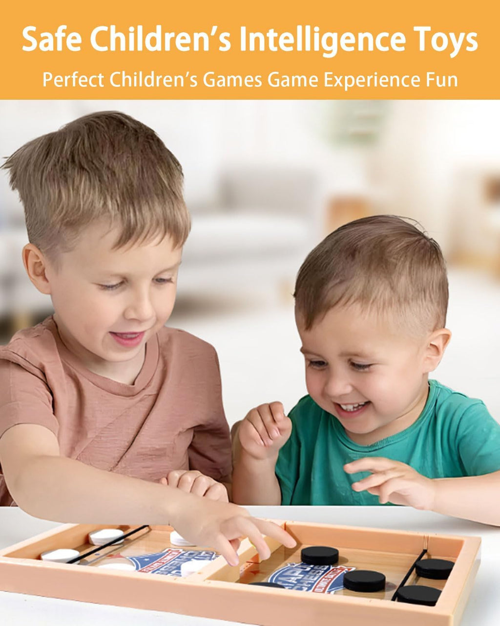 ✔ Catapult-style elastic slings – Shoot pucks through the center gate to your opponent’s side before they do the same!