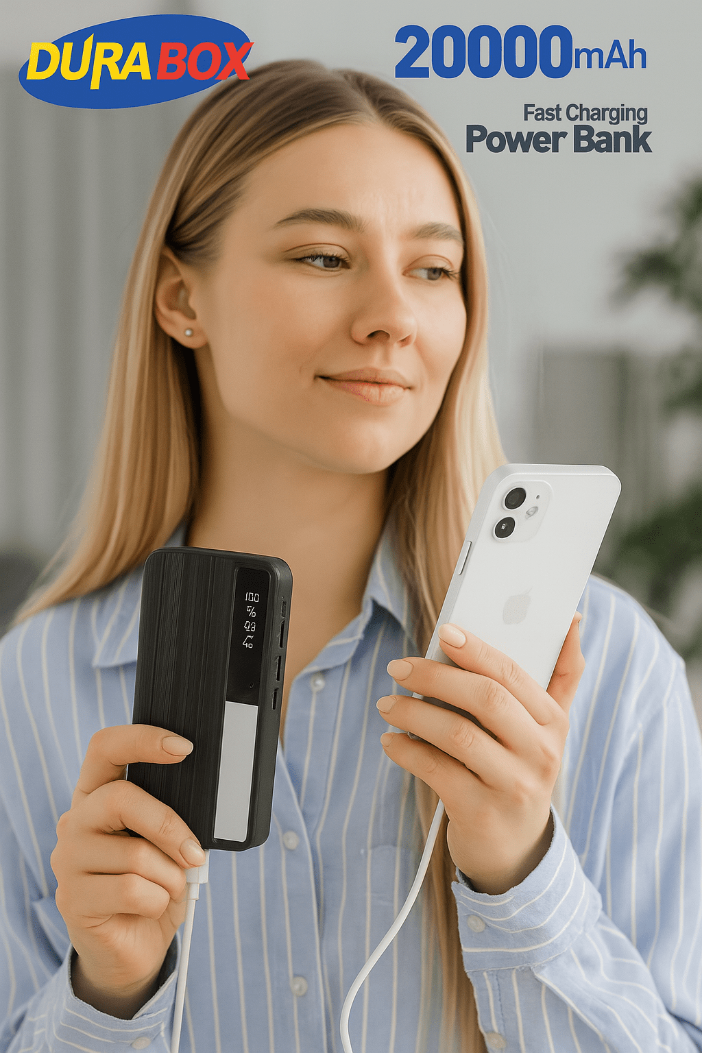 DuraBox 20000mAh Power Bank – A high-capacity portable charger with dual output, LED screen display, and fast charging capability for all your devices.